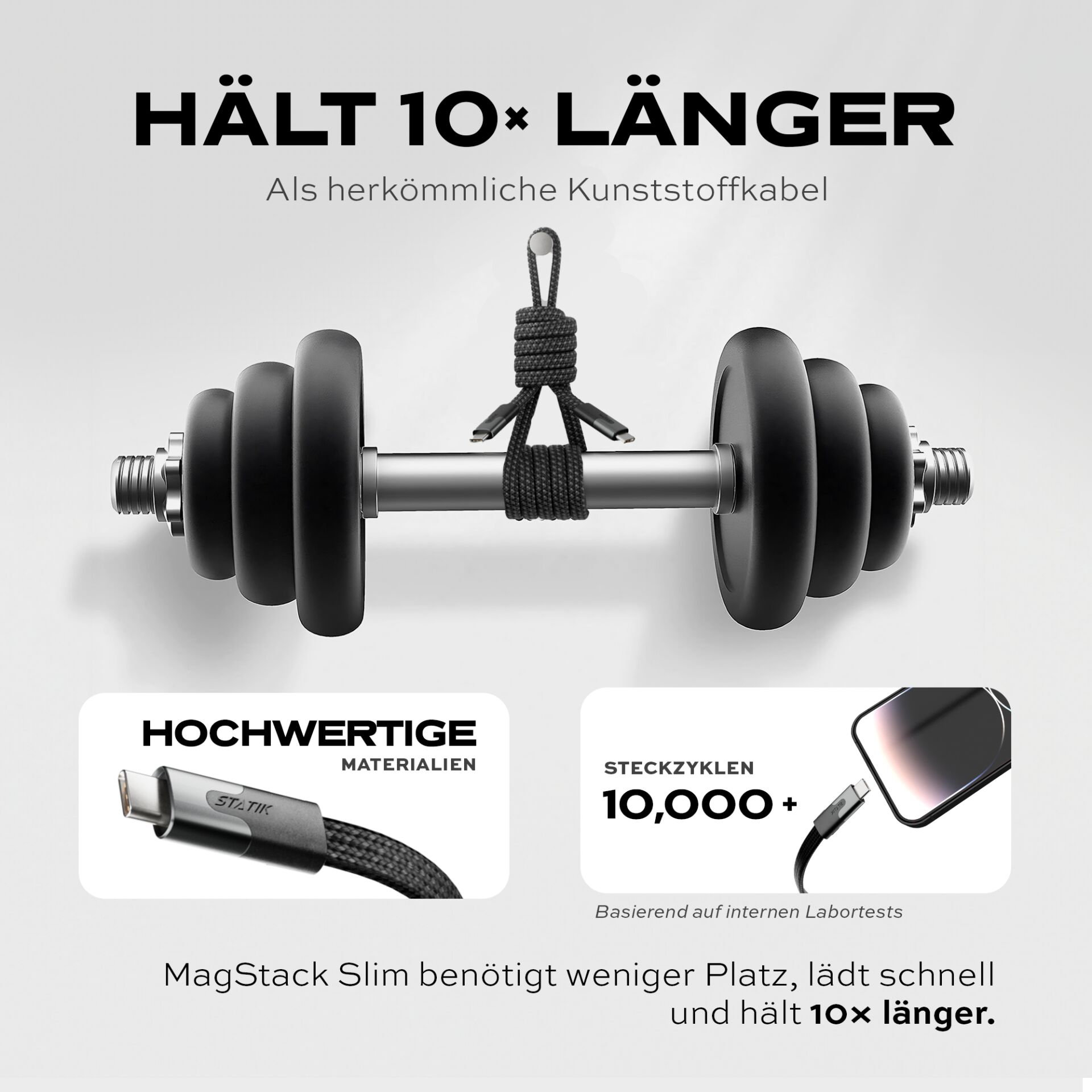 Το μαγνητικό καλώδιο USB-C χωρίς μπερδέματα STATIK MagStack Slim Pro συνδυάζει την απόδοση γρήγορης φόρτισης με την μαγνητική αυτοοργάνωση και την ανθεκτική κατασκευή. Η ενσωματωμένη μαγνητική δομή επιτρέπει στο καλώδιο να σχηματίζει αυτόματα μια συμπαγή σπείρα και να παραμένει αξιόπιστα στη θέση του – ιδανικό για έναν τακτοποιημένο χώρο εργασίας, εν κινήσει ή στο αυτοκίνητο.