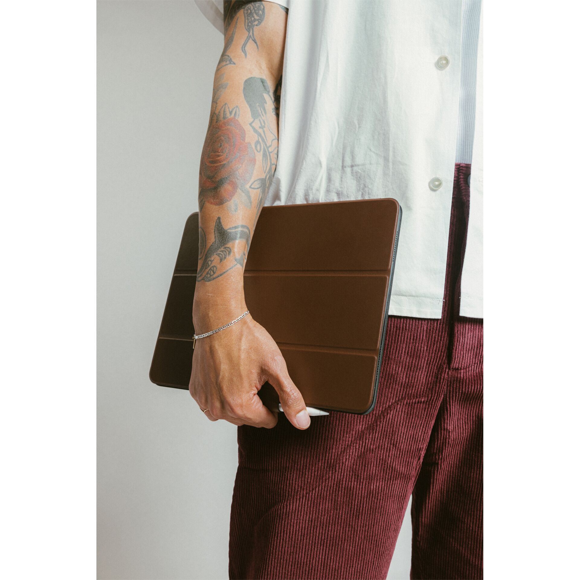 Στο εσωτερικό του Modern Leather Folio τοποθετούνται αρκετοί μαγνήτες. Από τη μία πλευρά, αυτό επιτρέπει τη σταθερή σύνδεση της θήκης στο πίσω μέρος του iPad και, από την άλλη, πολλές λειτουργίες kickstand με το κινητό μπροστινό κάλυμμα. Αυτό επιτρέπει στο μπροστινό μέρος του προστατευτικού καλύμματος να διπλώνεται και να τοποθετείται σε διαφορετικές γωνίες με τη βοήθεια των μαγνητών - ιδανικό για streaming, Facetiming, γραφή ή ανάγνωση.