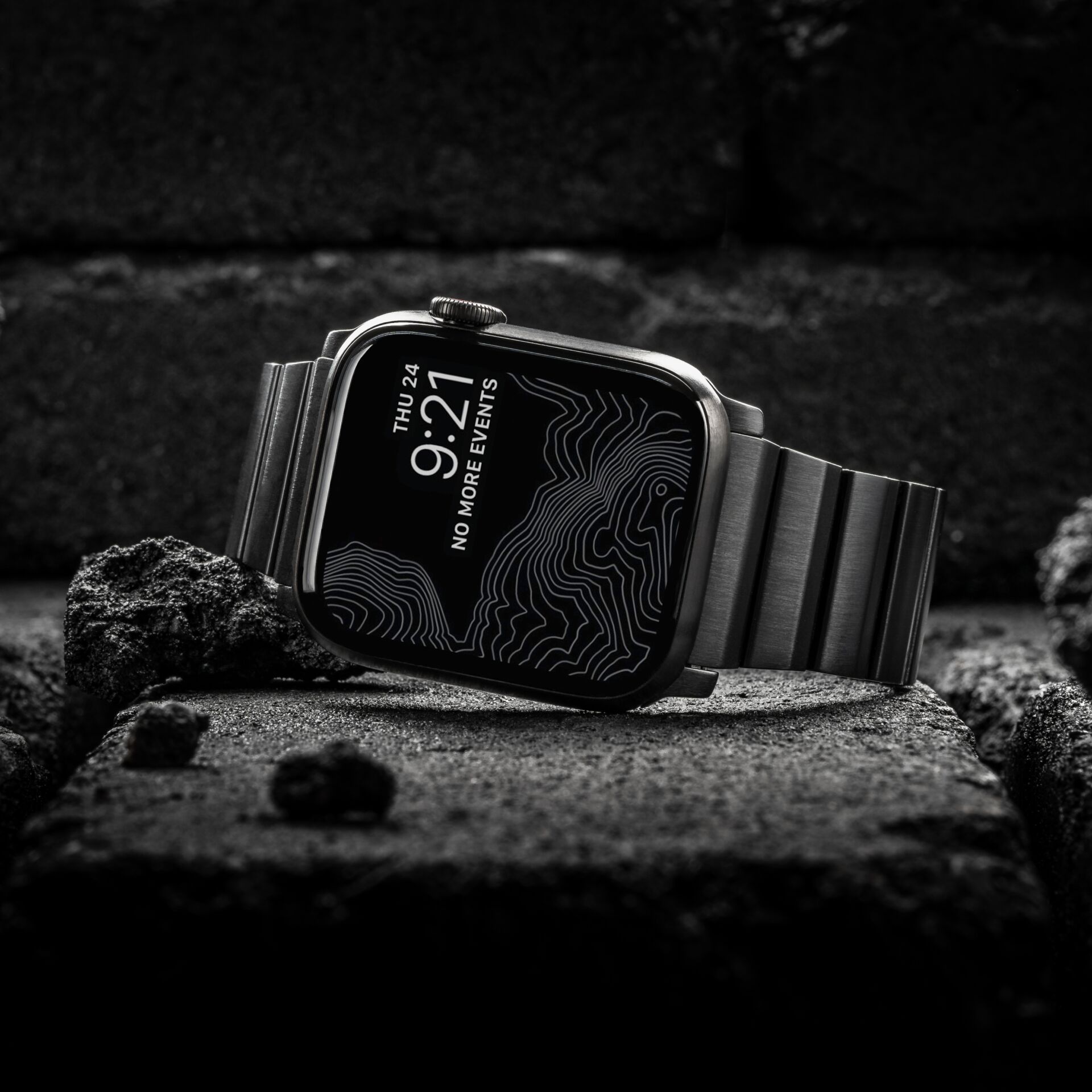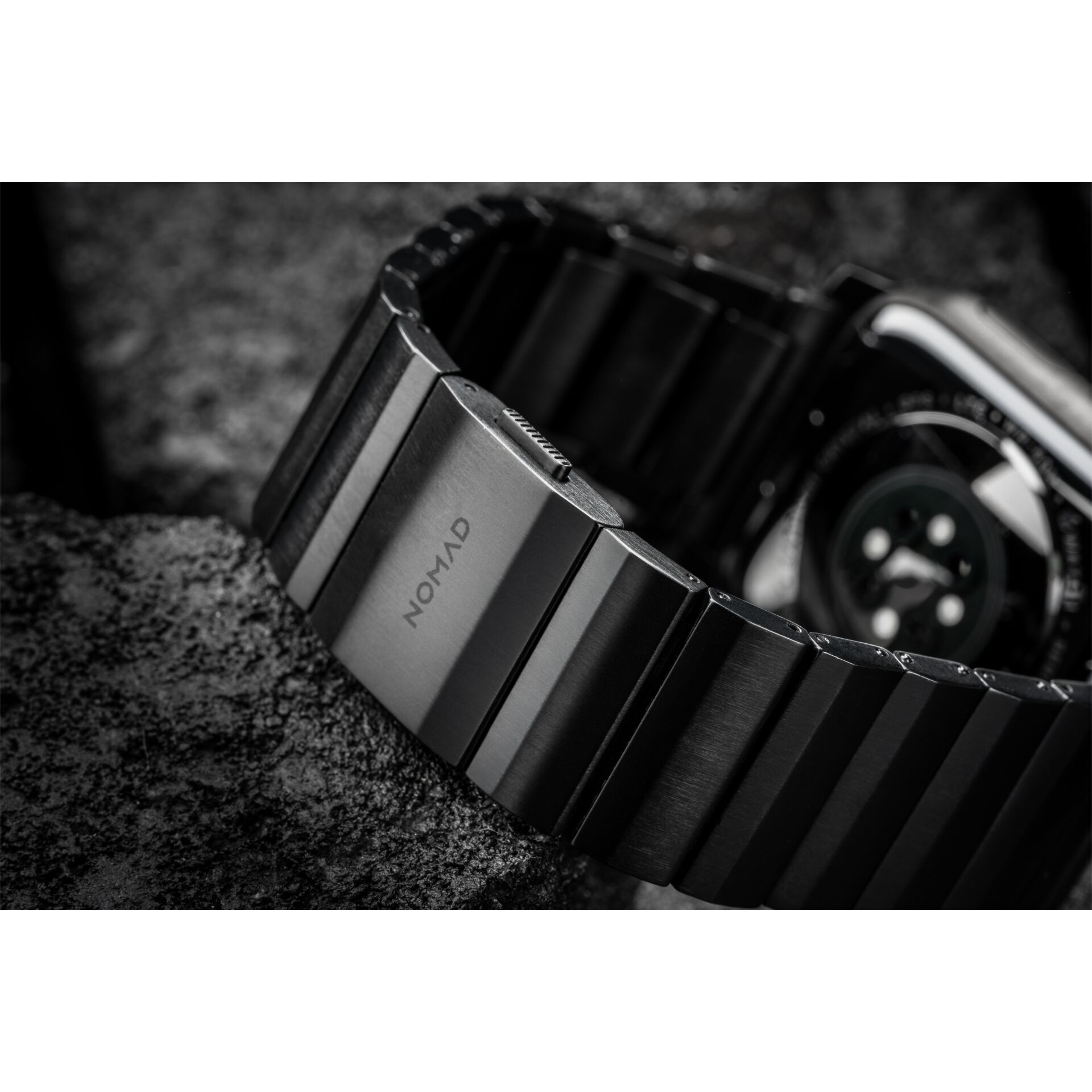The Nomad Titanium Strap V3 is a robust and precisely crafted watch strap for the Apple Watch. The strap is made from ninety-nine percent pure grade 5 titanium, which is used for the links and clasp components. This material is also used in aerospace and maritime applications and offers increased strength while remaining lightweight. The design is engineered for high mechanical strength while remaining balanced in terms of wearing comfort.