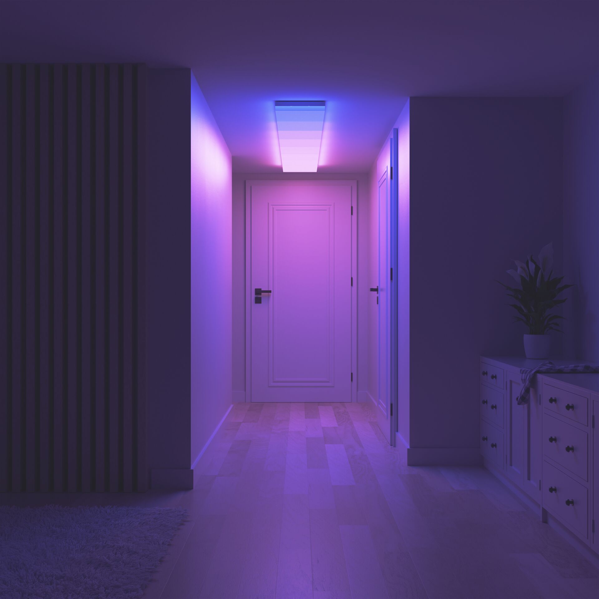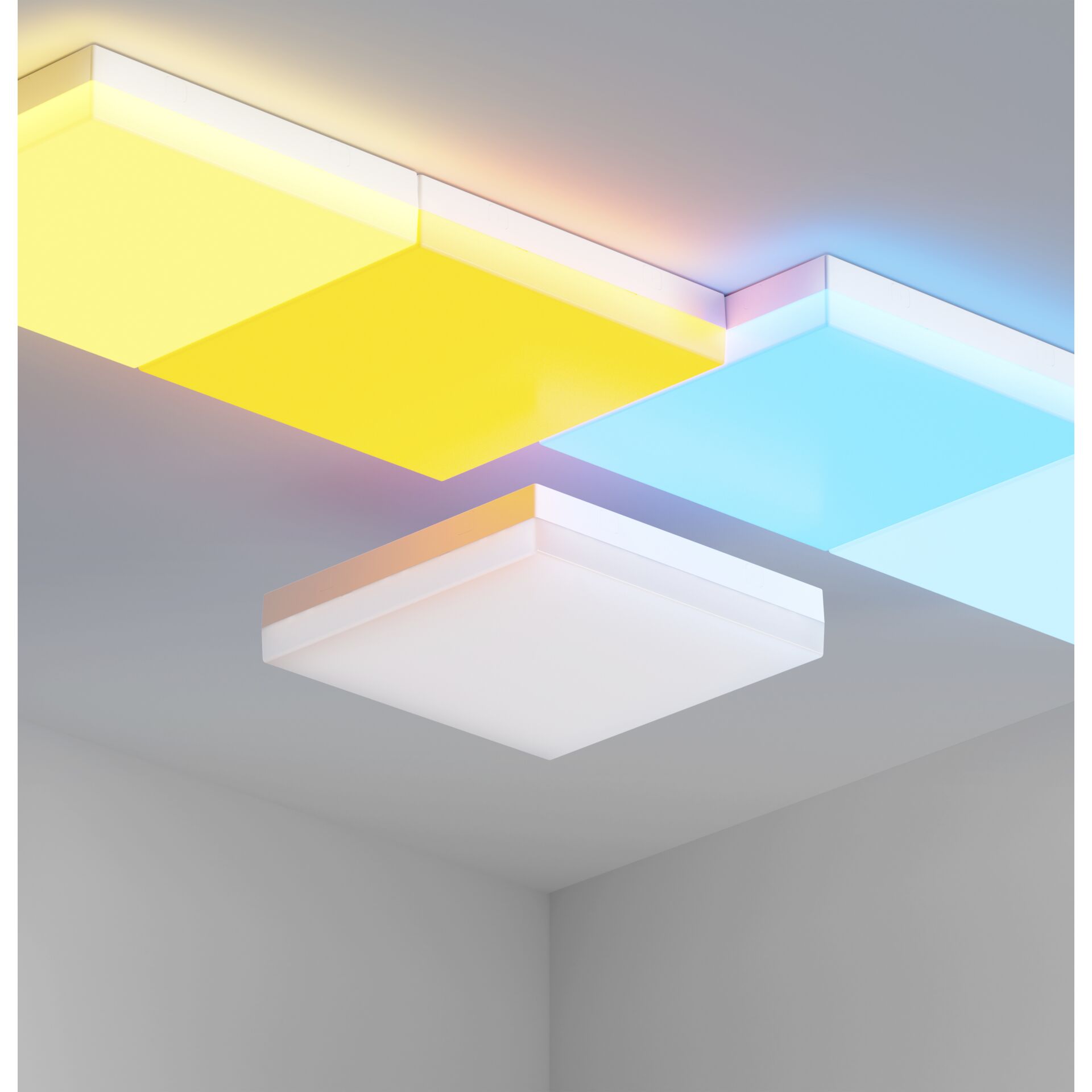 A little piece of heaven in your own home - Nanoleaf Skylight combines intelligent ceiling lighting with creative design. Thanks to their modular plug-in system, the square LED light panels can be transformed into luminous works of art on the ceiling and imitate the natural colors of the sky. Real-time music-light synchronization, AI-generated magical color scenes and the screen mirror function can be used to create unique lighting effects and an impressive color ambience. The lighting system is equipped with white light and a selection of over 16 million colors. This allows you to set your own routines at specific times, in which the ceiling lighting plays suitable colors depending on the time of day. Scenes resembling natural dusk create the right ambience in the evening, for example. Bright and natural light can also boost productivity. It can be controlled via the Nanoleaf app, voice control using a smart home system (Apple Home, Alexa, Google Home, Samsung SmartThings, IFTTT, Razer Chroma) or manually using your own light switch. Scenes and playlists can be created in the Nanoleaf app to create the right ambience for every occasion. The main panel included in the scope of delivery is permanently wired to the ceiling and can be linked to the two extension panels. In total, one main panel can be connected to up to 99 additional Skylight squares.