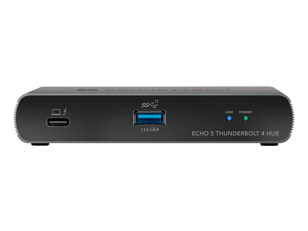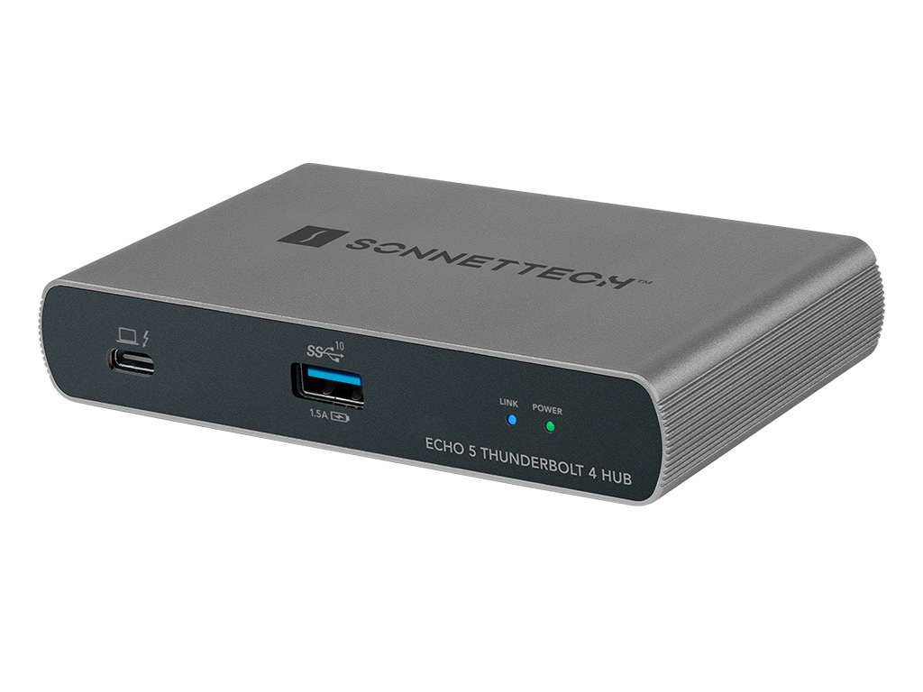 The Sonnet Echo 5 Thunderbolt 4 Hub is a compact, universal Thunderbolt 4 hub with four Thunderbolt 4 ports and 8K display support. It is compatible with all Thunderbolt 4 computers, all M1/M1 Pro/M1 Max Macs, all Thunderbolt 3 Macs and iPad Pro tablets with a Thunderbolt connection. Mac | Windows | iPad Pro. It's the Thunderbolt Hub you've always wanted, without paying for extra features you don't need. A single cable is all it takes to charge the laptop and connect a variety of Thunderbolt and USB peripherals. The Sonnet Echo 5 Thunderbolt 4 Hub - the compact universal hub for today and tomorrow.